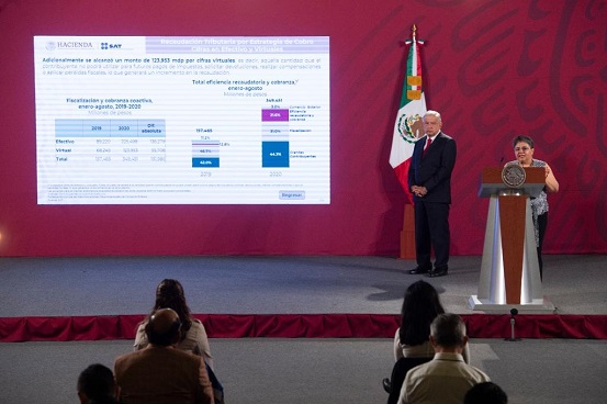 La jefa del SAT explicó que para mantener la recaudación en época de la pandemia se establecieron como objetivos ampliar la eficiencia recaudatoria, revisar la evasión y elusión fiscal y combatir la corrupción.