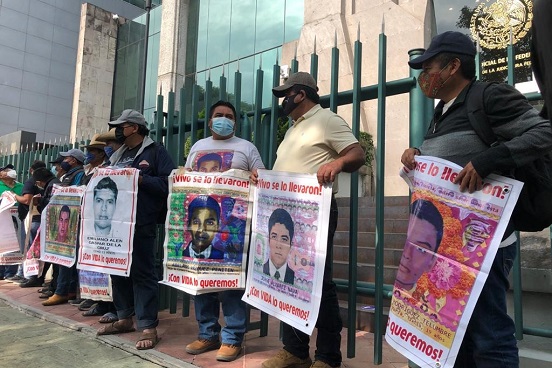 Los manifestantes están acompañados por el abogado de los familiares de las víctimas, Vidulfo Rosales y Felipe de la Cruz, vocero del movimiento. En uno minutos darán un pronunciamiento.