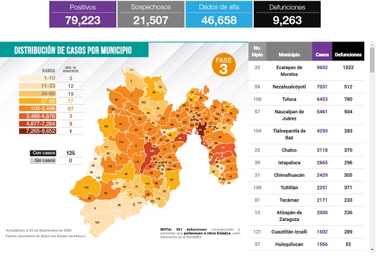 Edoméx suma 79,223 casos Covid-19 y 9,263 defunciones