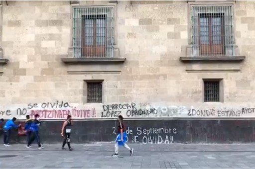 Al concluir la marcha por el sexto aniversario de la desaparición de los 43 normalistas de Ayotzinapa, jóvenes realizaron pintas en Palacio Nacional para exigir a las autoridades justicia por el caso Iguala.