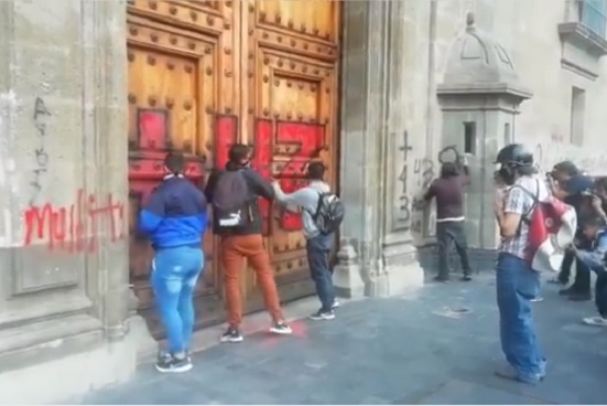 En la puerta principal de Palacio Nacional los jóvenes pintaron un 43 enorme, mientras en las paredes escribieron distintas frases como «26 de septiembre no se olvida», «Nos faltan 43» o «Ayotzinapa vive».