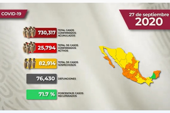 En el inicio de la semana epidemiológica 40 (del 27 de septiembre al 3 de octubre), la pandemia de Covid-19 registró 3 mil 886 nuevas confirmaciones, con lo que la cantidad de personas que hasta ahora han tenido la enfermedad ascendió a 730 mil 317. También se tuvieron los resultados de 187 pruebas confirmatorias del coronavirus de personas que fallecieron. Al día de hoy el acumulado de defunciones es de 76 mil 430.
