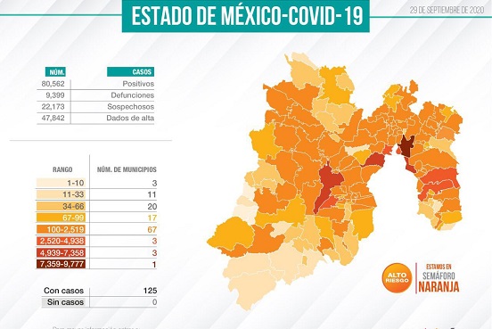 Edoméx suma 80,562 casos Covid-19 y 9,399 defunciones con 47,842 dados de alta