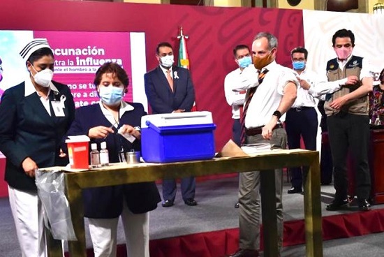 En el arranque de la campaña de vacunación contra la influenza, enfermeros del sector salud, entre ellos la Jefa Fabiana, aplicaron la vacuna contra la influenza al director general del IMSS, Zoé Robledo; al subsecretario de Prevención y Promoción de la Salud, Hugo López-Gatell Ramírez, y a otros funcionarios del sector salud.
