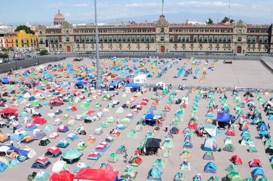 Pasadas las 12 horas ingresaron a la Plaza de la Constitución e inmediatamente comenzaron a instalarse en campamento, justo enfrente de Palacio Nacional, en la mitad de la plancha que permanecía desocupada.