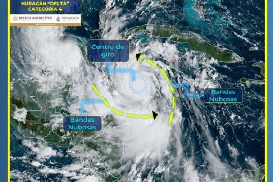 El huracán Delta se intensificó a categoría 4 en la escala Saffir-Simpson, a las 10:00 horas, tiempo del centro de México. Su centro se localiza a 520 kilómetros (km) al este-sureste de Cozumel y a 550 km de Cancún, Quintana Roo, con vientos máximos sostenidos de 215 kilómetros por hora (km/h), rachas de hasta 250 km/h y desplazamiento hacia el oeste-noroeste a 26 km/h.