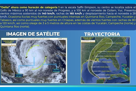 Durante la tarde de este día Delta, ya en aguas del Golfo de México, se debilitó a huracán categoría 1. A las 16 horas, tiempo del centro de México, su centro se localizó aproximadamente a 90 kilómetros al nor-noreste de Progreso, y a 100 kilómetros al noroeste de Dzilam, localidades de Yucatán.