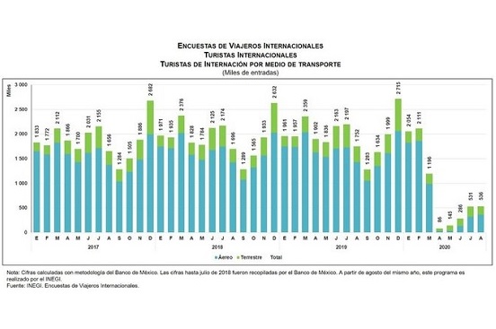La Encuesta de Viajeros Internacionales (EVI) indica que en el periodo de tiempo referido sólo arribaron al territorio mexicano 535 mil 640 personas procedentes de otras naciones, lo que significó una diferencia de un millón 216 mil 047 respecto al dato observado un año atrás.