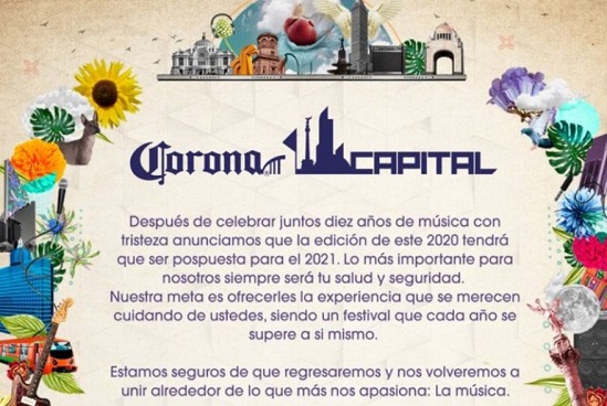 “El festival Corona Capital queda pospuesto para el 2021”, informó la organización a través de su Twitter oficial.