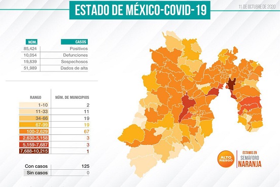 Edoméx suma 85,424 casos Covid-19 y 10,054 defunciones con 51,989 dados de alta
