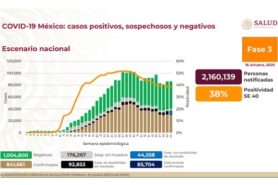 Tras recordar que se debe valorar el nivel de riesgo que se vive en cada estado para limitar las actividades sociales o realizarlas con las precauciones de sana distancia, lavado de manos y con aplicación de la etiqueta respiratoria, detalló que se superó el millón de personas con resultado negativo con un millón 4 mil 800, mientras que el porcentaje de positividad se mantiene en 38 por ciento para la semana epidemiológica 40. Las personas recuperadas suman los 612 mil 216.