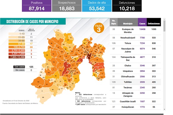 Edoméx suma 87,914 casos Covid-19 y 10,218 defunciones con 53,542 dados de alta