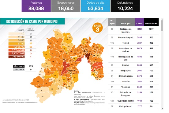 Edoméx suma 88,088 casos Covid-19 y 10,224 defunciones con 53,834 que lograron el alta
