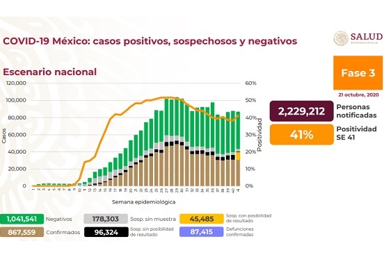 En tanto, los casos acumulados totales registran 867 mil 559 casos, es decir 6 mil 845 más que el martes, mientras que las defunciones totales por el virus SARS CoV2 alcanzan las 87 mil 415, es decir 522 más que un día anterior.