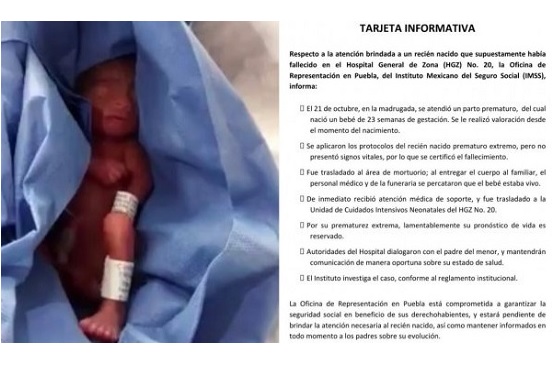 A través de un comunicado, el Instituto Mexicano del Seguro Social (IMSS) señaló que se investiga el caso de un bebé que fue erróneamente dado por muerto en La Margarita, Puebla.