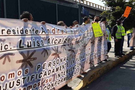 Los trabajadores despedidos se manifiestan con mantas y pancartas en la banqueta del circuito interior sin afectar el tránsito de vehículos