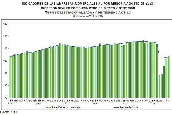 Durante el tercer mes de la “nueva normalidad”, los ingresos de las empresas comerciales al menudeo se ubicaron en niveles similares a los registrados en 2015 y 10 puntos porcentuales del nivel registrado a inicio de año. En su variación anual, las ventas minoristas descendieron 10.1 por ciento.