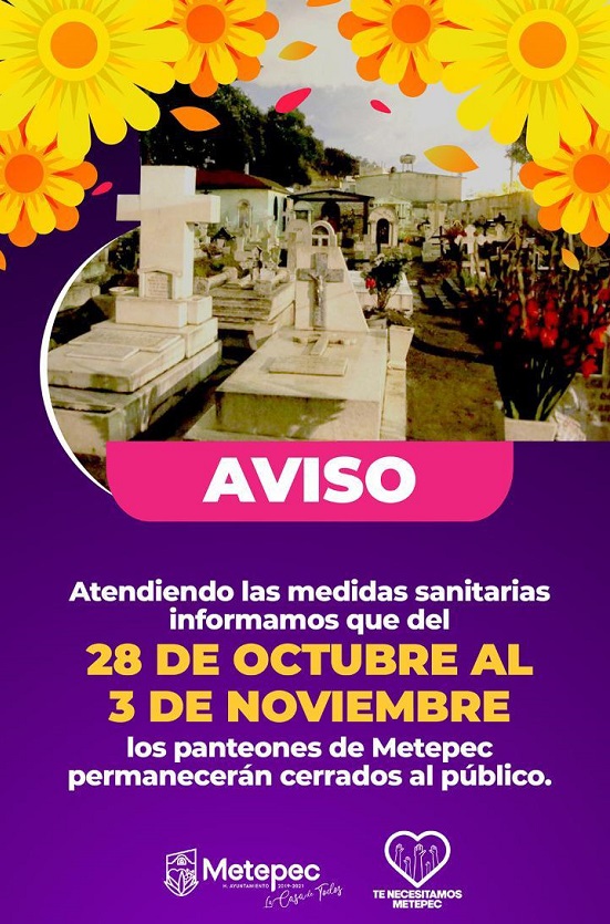 Derivado del semáforo de contagio en color naranja que prevalece en la entidad, los 11 panteones que hay en Metepec, permanecerán cerrados del 28 de octubre al 3 de noviembre del presente año, con el objetivo de evitar contagios del virus SarsCov2 que genera la enfermedad Covid-19.