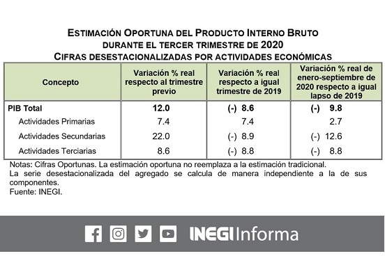 En el tercer trimestre la actividad económica del país creció 12 por ciento en términos reales respecto al periodo inmediato anterior, con lo que logró repuntar tras la profunda caída observada entre abril y junio, informó este viernes el Instituto Nacional de Estadística y Geografía (Inegi).