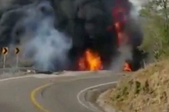 En redes sociales compartieron videos del momento que se estaba incendiando la pipa después de la explosión, donde se aprecia una enorme columna de fuego y humo desde una distancia considerable.