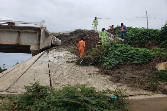 En Tabasco, el puente La Pigua III presentó una falla en el muro de contención de acceso, trabajadores de la SCT se encuentran en el lugar para iniciar los trabajos de rehabilitación. El tráfico vehicular está controlado en 3 de los 5 carriles.