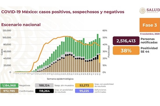 México reportó este lunes 972 mil 785 casos confirmados acumulados de Covid-19, es decir 4 mil 960 que las reportadas el domingo. En tanto las defunciones totales son 95 mil 225, lo que representa 198 más que un día anterior. Mientras que la epidemia activa se encuentra en 45 mil 17 personas.