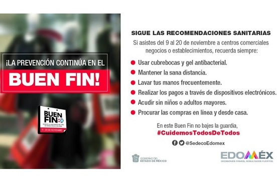 Derivado de los acuerdos establecidos en la sesión del Grupo de Coordinación Territorial para la Construcción de la Paz en la entidad, que encabezó el Gobernador Alfredo Del Mazo Maza, el Gobierno del Estado de México, a través de la Secretaría General de Gobierno, exhorta a los alcaldes de los 125 municipios de la entidad a instrumentar las medidas necesarias para monitorear y supervisar el cumplimiento de los protocolos sanitarios por la pandemia de COVID-19, en el marco de El Buen Fin 2020, que se lleva a cabo del 9 al 20 de noviembre.