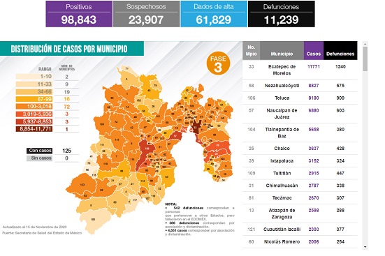 Edoméx suma 98,843 casos Covid-19 y 11,239 defunciones con 61,829 dados de alta