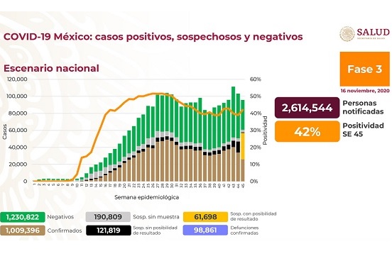 En la semana epidemiológica 45 (del 1 al 7 de noviembre) la tendencia nacional de la pandemia registró una disminución de 3 por ciento con respecto a la semana previa. En cuanto a las defunciones, el funcionario presentó una gráfica en la que se observa también una disminución de 2 por ciento en el mismo lapso.