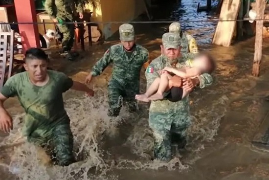 Elementos de la Secretaría de la Defensa Nacional (Sedena) y Fuerzas Armadas, lograron salvar la vida de un niño que se estaba ahogando dentro de una vivienda inundada en Tabasco.