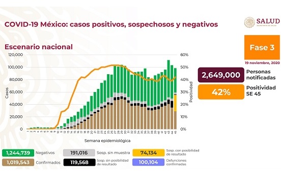 México rebasó los cien mil decesos confirmados por Covid-19 a ocho meses del primer fallecimiento certificado el pasado 18 de marzo. La Secretaría de Salud (Ssa) indicó que desde el inicio de la pandemia han muerto por la enfermedad cien mil 104 personas, con 576 decesos corroboradas por laboratorio en las últimas 24 horas.