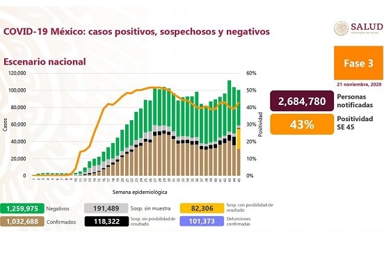 En la conferencia vespertina en Palacio Nacional, informó que de los 2 millones 684 mil 78 personas notificadas, un millón 259 mil 975 han obtenido un resultado negativo. En cuanto a la tasa promedio de positividad indicó que al cierre de la semana epidemiológica 45, se elevó a 43 por ciento.
