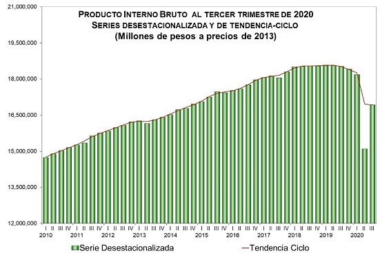 Respecto al PIB del segundo trimestre de 2020, cuyo colapso rompió con toda estadística previa, la actividad económica repuntó 12.1 por ciento entre julio y septiembre. Las actividades primarias crecieron 8 por ciento, las secundarias lo hicieron 21.7 por ciento y las terciarias 8.8 por ciento.