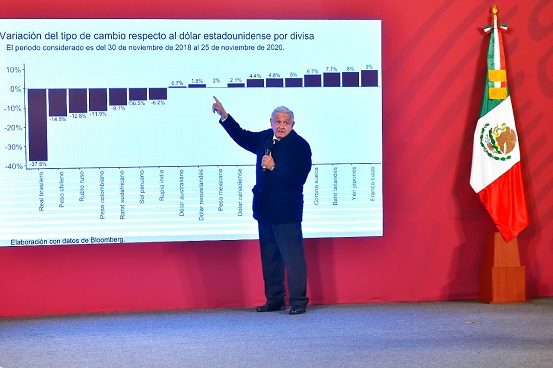 También resaltó que el peso mexicano no se ha depreciado. “A pesar de la pandemia, arriba, dos por ciento”, pero lo más importante es “la recuperación de los empleos. Ya vamos hacia 600 mil empleos recuperados, desde agosto. “Vamos avanzando, no se puede decir que el país esté mal”.