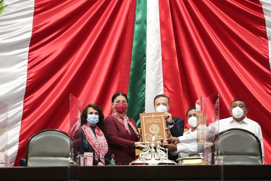 En sesión semipresencial, la presidenta de la Cámara de Diputados, Dulce María Sauri Riancho, recibió un ejemplar de la Constitución Política del estado de Quintana Roo, traducida a lengua Maya.
