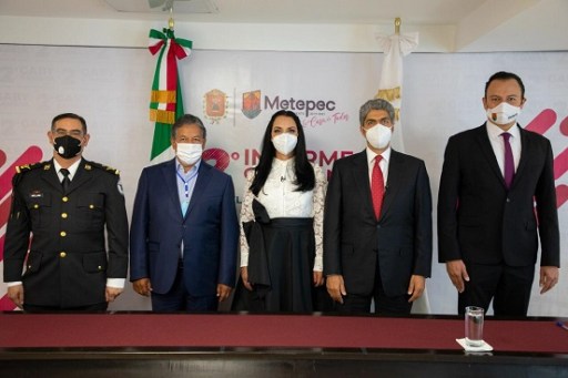 En lo que fue la Cuarta Sesión Solemne de Cabildo, la presidenta municipal entregó a los integrantes del Ayuntamiento y al Secretario General de Gobierno del Estado de México, Ernesto Nemer Álvarez, representante del ejecutivo estatal Alfredo del Mazo Maza, el documento que describe el estado que guarda la administración pública local y resultados del trabajo realizado en el 2020.
