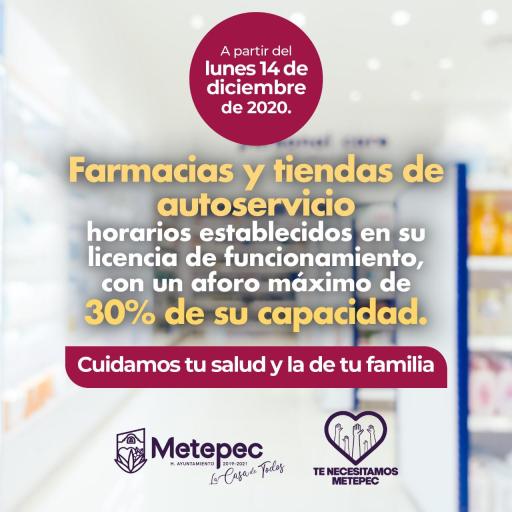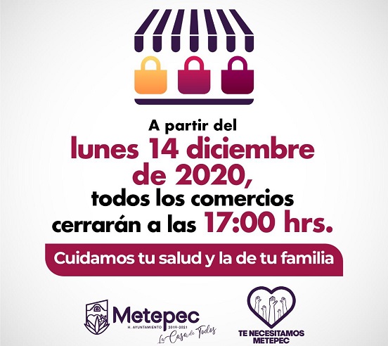 La alcaldesa de Metepec, Gaby Gamboa Sánchez, informó que a partir del próximo lunes 14 de diciembre y hasta que disminuya el índice de contagio, se adecuarán horarios para el funcionamiento de establecimientos comerciales, a fin de evitar transmisión por el virus SARS CoV-2 que ha tenido un incremento sustancial en los últimos días en toda la entidad.