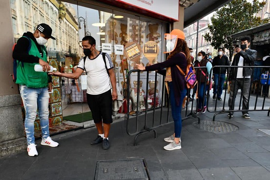 En estos puntos, los servidores públicos suministran gel antibacterial a los peatones y controlan el flujo de personas en el primer cuadro de la Ciudad de México.
