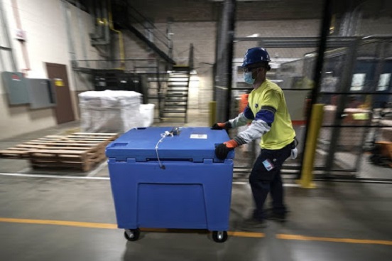 Los paquetes refrigerados por hielo seco de Pfizer pueden contener hasta 4.875 dosis, y la primera etapa de su viaje será desde Kalamazoo hasta los aviones situados cerca. Los trabajadores cargarán la vacuna – que debe mantenerse a temperaturas subárticas – en el avión que los llevará a los centros de carga aérea de United Parcel Service o FedEx en Louisville, Kentucky, y Memphis, Tennessee, respectivamente.