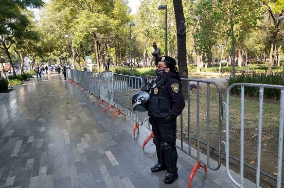 La Alameda Central está cercada con vallas por lo que los usuarios no pueden ingresar a este espacio público. Policías resguardan el parque.