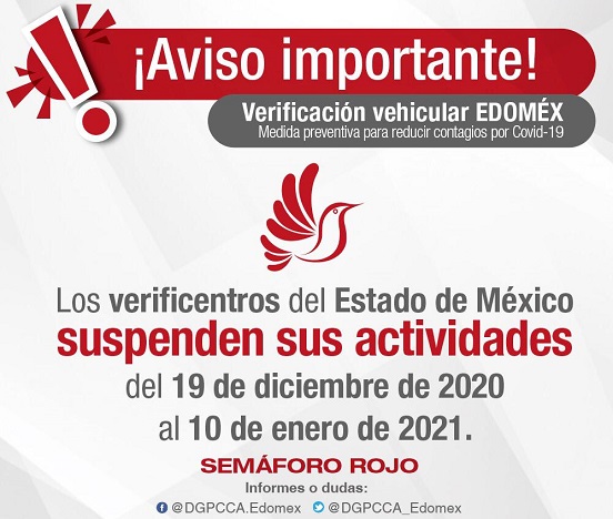 En atención a las medidas suscritas por el Gobernador del Estado de México Alfredo Del Mazo, en coordinación con el Gobierno de la Ciudad de México, para mitigar y controlar los Riesgos para la Salud que implica la enfermedad por el Virus (COVID-19), la Secretaría del Medio Ambiente (SMA), a través de la Dirección General de Prevención y Control de la Contaminación Atmosférica (DGPCCA), informan que los Verificentros de la entidad suspenderán actividades del 19 de diciembre de 2020 al 10 de enero de 2021.