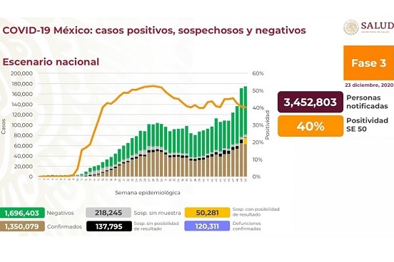Ruy López Ridaura, director general del Centro Nacional de Programas Preventivos y Control de Enfermedades, detalló que de los 3 millones 452 mil 803 de personas notificadas, un millón 696 mil 403 han obtenido un resultado negativo. Agregó que la tasa de positividad se mantiene en 40 por ciento para la semana epidemiológica 50.
