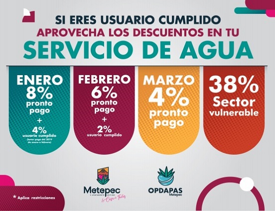 Por lo que respecta al servicio de agua potable, el descuento es del 8, 6 y 4 por ciento para los tres primeros meses, respectivamente; por pronto pago es de 4 y 2 por ciento más en enero y febrero y 38 por ciento para el sector vulnerable.