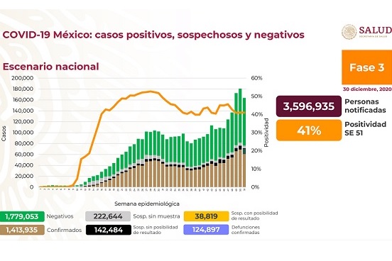 Agregó que para la semana epidemiológica 51, la tasa de positividad es de 41 por ciento, es decir, que 4 de cada diez personas que se realizan la prueba, obtienen un resultado positivo. Sin embargo, indicó que hay una reducción de 9 por ciento en los casos estimados, lo que significa que “en este segundo rebrote, es posible estemos cerca de llegar a una meseta, aunque aún nos faltan varios meses de la época invernal”.