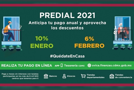 Además, el pago del predial podrá realizarse a través de la aplicación móvil Tesorería CDMX o en la página web de la Secretaría de Administración y Finanzas, como parte de las medidas para que la población se quede en casa durante la pandemia por covid-19.