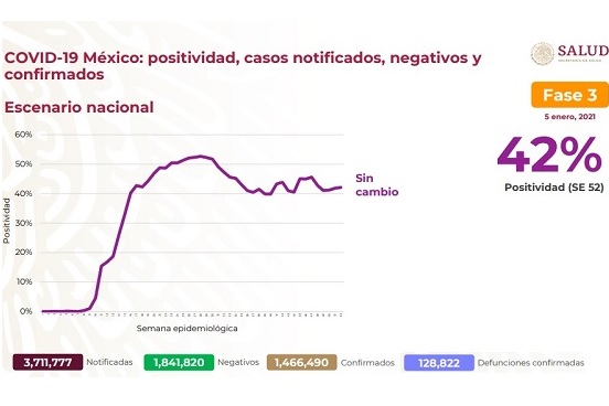Por lo que respecta a los casos activos estimados, indicó que llegan a 68 mil 767, lo que representa 4 por ciento del total de casos estimados, los cuales, dijo, presenta una reducción del 19 por ciento. La tasa de positividad para la semana epidemiológica 52 es del 42 por ciento de quienes se han aplicado una prueba para detectar si están o no contagiados.