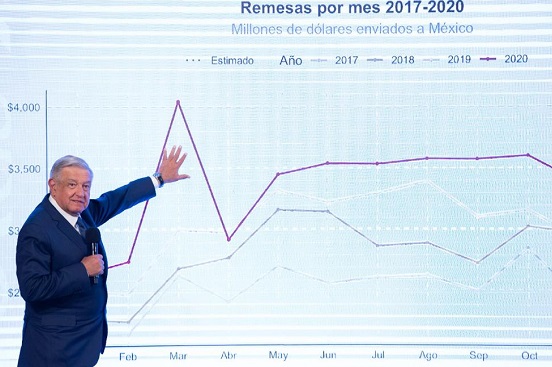 López Obrador subrayó que esta nueva marca se logra en un contexto difícil marcado por la pandemia de Covid-19 y la crisis económica. Aseguró que los dólares que los paisanos envían a sus familias en México “fortalecen la economía popular al consolidar el poder de compra de los pueblos. Hay circulante, ingresos y bienestar”.