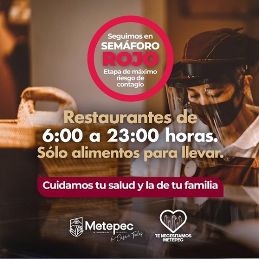 De esta manera, los restaurantes deberán estar cerrados, a pesar de la solicitud del ramo de abrir dichos negocios, realizada también la semana pasada. De no acatar la disposición, la administración de Metepec, a través de la Dirección de Gobernación, aplicará las sanciones conducentes que pueden llegar hasta la clausura del establecimiento, ello, dentro del operativo especial coordinado con la Dirección de Seguridad Pública y Tránsito de Metepec y el Instituto de Verificación Administrativa del Estado de México.