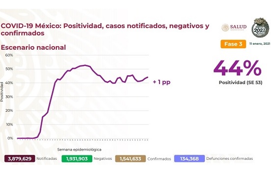 En la presentación del reporte sobre el comportamiento de la pandemia en Palacio Nacional, José Luis Alomía, director de Epidemiología de la Secretaría de Salud, destacó que la tendencia de la curva epidémica registró un incremento de 4 por ciento en la última semana de diciembre de 2020, con respecto a la semana 52 (del 20 al 26 de diciembre).
