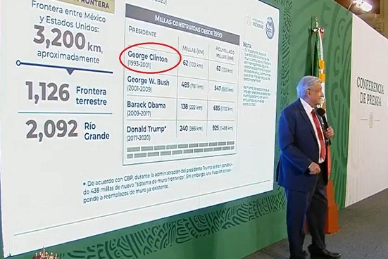 Al considerar que es muy bueno que el nuevo presidente de Estados Unidos, Joe Biden, se comprometa a no seguir con la construcción del muro fronterizo con México, el presidente Andrés Manuel López Obrador presentó una imagen en la que al expresidente de Estados Unidos, William Clinton apareció como “George Clinton”.